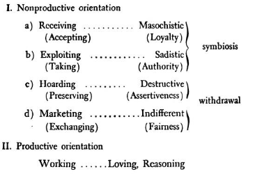 Nelle intersezioni di questi due concetti Fromm aveva dedotto tre tipi di relazione al mondo esterno, cioè simbiosi, fuga, e amore, da cui poi noi possiamo ricavare gli archetipi, nominate propriamente “orientazioni”. Prima di passare alle loro descrizioni, ci terrei a precisare che questi non sono altro che procedimenti per affrontare la libertà e la persona stessa con tutte le sue esperienze, procedimenti descrivibili come “produttivi” e “non produttivi” in base alla moralità e benessere comportati da essi.