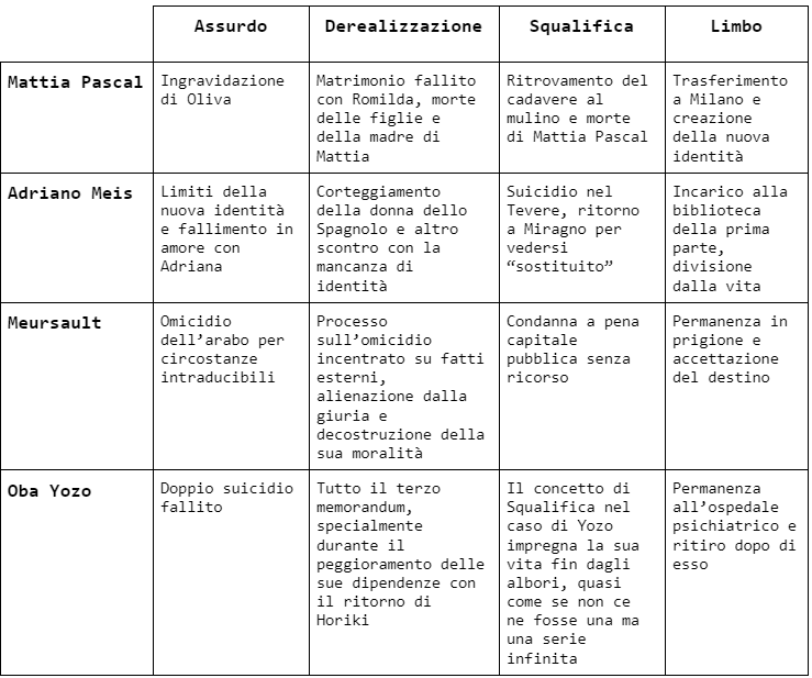 Narrativa simmetrica si trova nel personaggio di Meursault di Camus, che come il suo Sisifo è l’unico personaggio dei tre che riesce a trovare sollievo pur avendo ricevuto il destino più crudele, la condanna a morte. Se Mattia è un esistenzialista, Meursault è un assurdista: il temperamento schizoide lo rende incapace di connettersi emotivamente alle persone e le loro morali, è vissuto sempre in un limbo senza maschere pur non avendo mai avuto sviluppo, e messo alla prova da una società che ora lo rigetta per la sua libertà, egli inizialmente sì, si abbandona alla disperazione, ma riuscendo ad accettare lo stato paradossale ed Assurdo della sua esistenza per ottenere redenzione, raggiungendo una vera uguaglianza con Dio e l’uomo.
